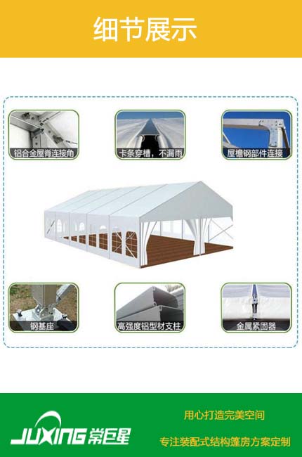 常巨星裝配式篷房公司是一家篷房研發(fā)、生產(chǎn)、銷售、租賃于一體的綜合性篷房公司。常巨星公司秉著誠信經(jīng)營、客戶至上的經(jīng)驗理念服務(wù)客戶。 常巨星篷房適用于:室外臨時展廳,新聞發(fā)布會,巡回展,時裝秀,接待問訊處,貴賓休息廳,餐飲區(qū)、產(chǎn)品促銷、主題研討會、奠基儀式、戶外活動、公司慶典、短期倉庫、婚禮等。“銳意進取”的意識是常巨星追趕時尚潮流的保障。美侖美奐的品質(zhì)、優(yōu)良周到的服務(wù)是我們至誠的追求和不變的信念。我們將與您一道把活動打造時尚、舒心、精彩!我們將確保我們的服務(wù)與您的要求和諧一致,我們關(guān)注篷房的每一個細節(jié),致力于打造一個舒適戶外活動空間?,F(xiàn)有篷房主體框架為中空鋁合金結(jié)構(gòu),連接部位為采用國家焊接鋼結(jié)構(gòu),可調(diào)節(jié)式基座可彌補場地的不平,篷房采用PVC篷布,該篷布具有不拉伸的良好性能,不透光,采用高頻焊接技術(shù),篷房抗風(fēng)能力達到80-100公里/小時。具有體積小,儲存方便,拆裝靈活快捷易運輸?shù)忍攸c,單位組合式結(jié)構(gòu),可根據(jù)場地的大小自由增加,對搭建場地?zé)o特殊要求,一般場地如草地、大理石地、瀝青地面、水泥地均可。篷房內(nèi)無支柱,場地空間得到利用。