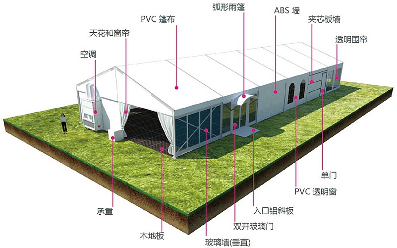 大篷房BT系列還有不同的形狀和尺寸,例如:正方形、六邊形、八邊形、十邊形、十二邊形和雙層結(jié)構(gòu)。大型篷房有多種可供選項(xiàng)購的配置,其功能和用途更為強(qiáng)大。例如:帶透明PVC窗的邊墻布、地錨釘、立柱承重盤、天花內(nèi)飾、玻璃幕墻、ABS硬體墻、三明治墻、彩鋼板墻、玻璃門、滑軌門、電動(dòng)卷閘門、全透明篷布和邊墻布、地板系統(tǒng)、排水槽、1/2六邊形、八邊形、十邊形和十二邊形的末端單元以及帶尖頂?shù)呐穹繂卧取?br />